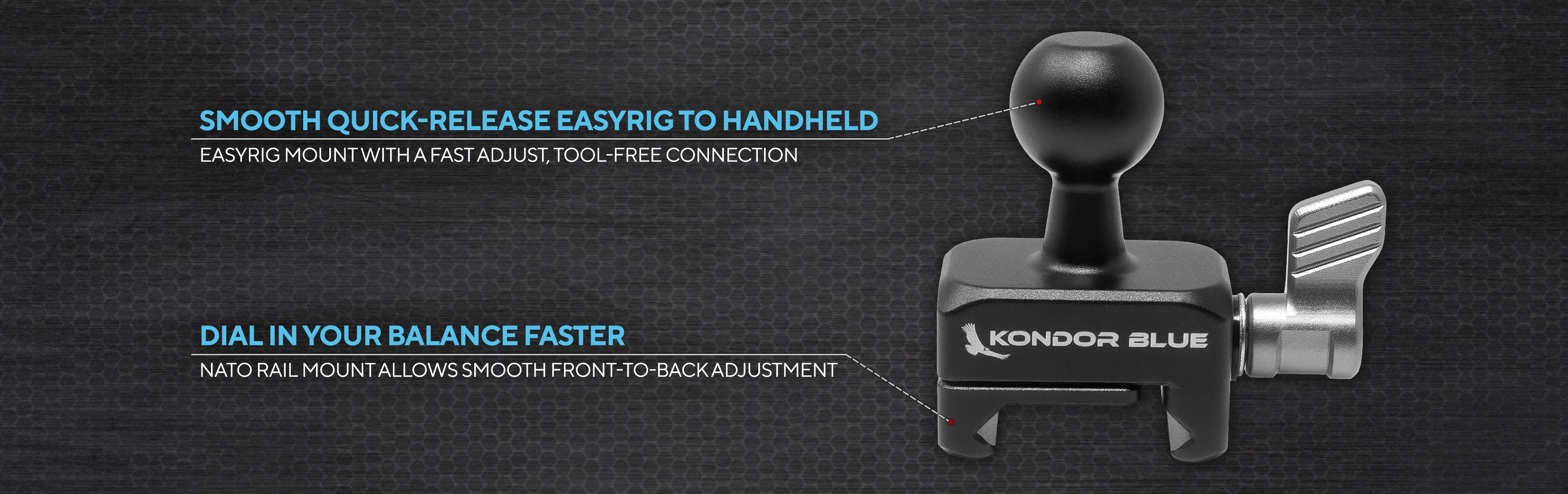 Built around KONDOR BLUE’s precision dovetail NATO design, this clamp allows for a drop-in style mounting with captive hardware for worry-free use on set. Having a NATO to Easyrig Quick Release Camera Mount allows for smooth front-to-back adjustment for dialing in center of gravity—regardless of lens choice—while providing a stable, quick-release connection.