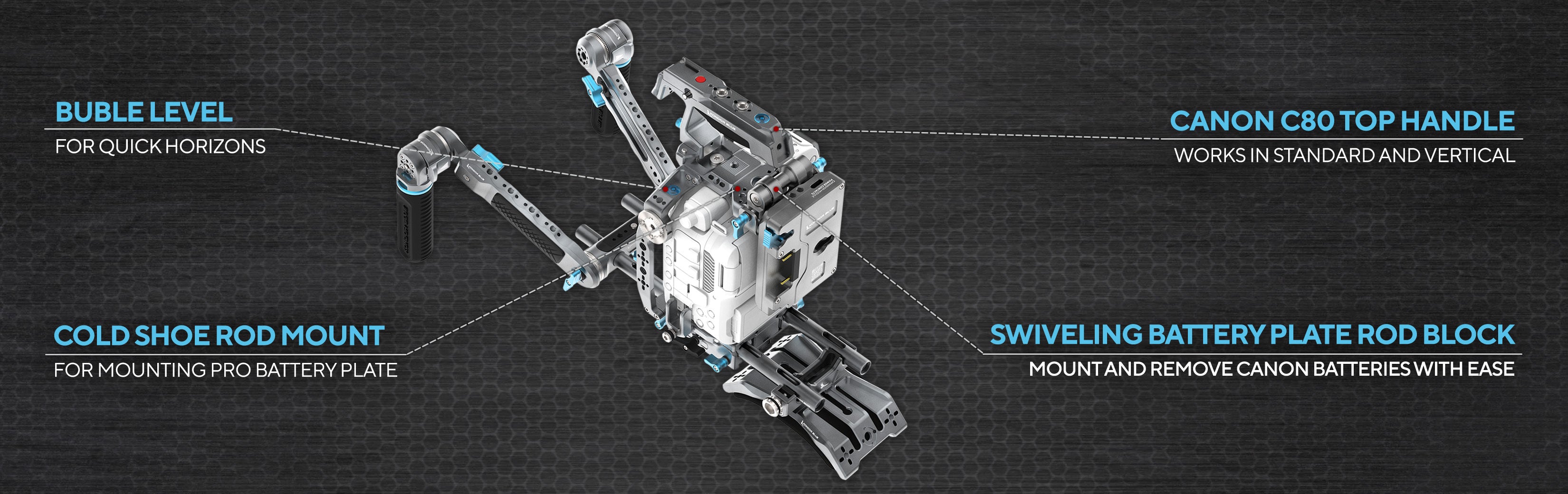 The Canon C80 is an incredible camera built off of the much loved Canon C70. After years of using the C70 in the field and taking tons of feedback from customers, we’ve created a one-of-a-kind Canon C80 Cage. With modularity baked into its DNA, the C80 Cage allows for use in multiple configurations: