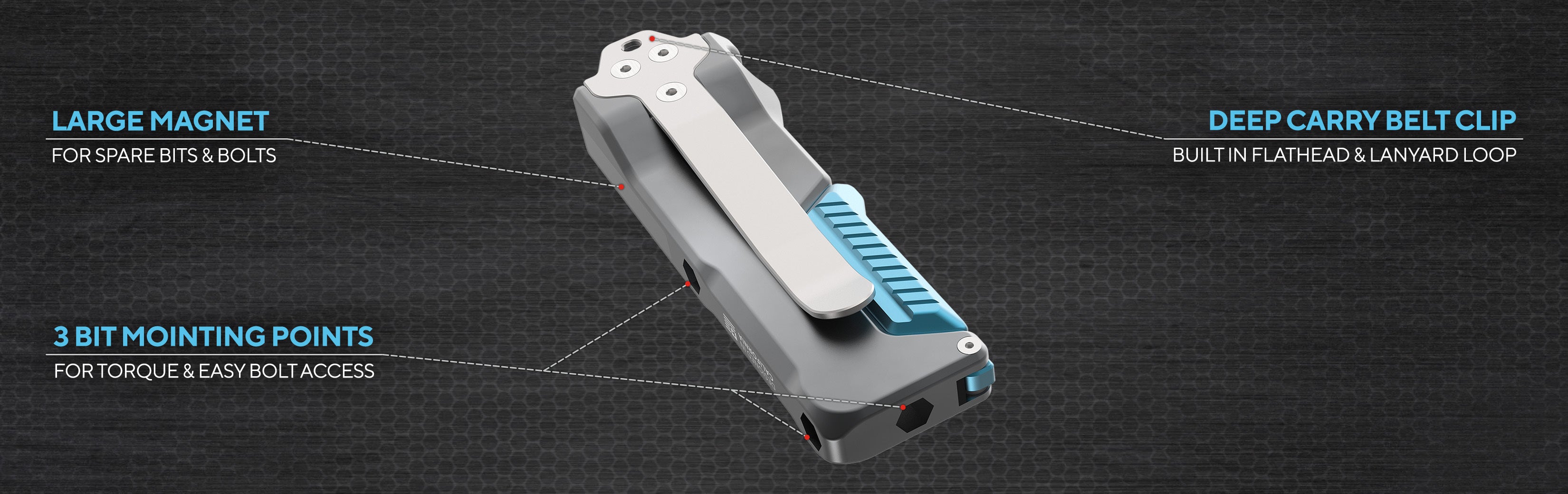 The EDC Multi-Tool features two main modes: Driver and Torque. In either mode, bits are held magnetically in place. Driver mode uses bits at the top of the tool for a quick screwdriver-like feel. Torque mode inserts the bits on the side—either at the end or the center—to provide more leverage when needing to get a little extra push when tightening or loosening a bolt. You can even load bits at multiple locations at a time speeding up rig assembly time.