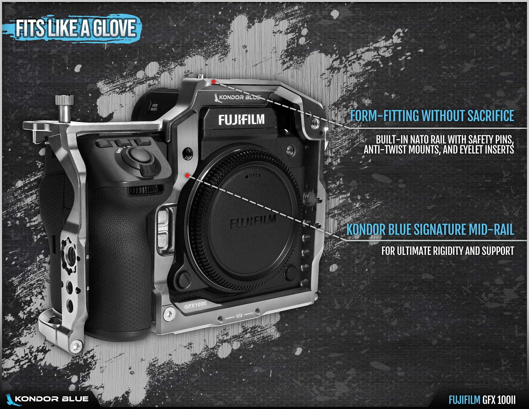 The GFX100 II is a landmark camera bringing 102MP BSI CMOS 44x33mm medium format sensor to the masses. When designing the cage, we knew we needed to create something truly special. Our design philosophy was anchored on speed between setups, strength suited for the biggest sets, and an overall sleekness that the camera’s design demands. Those pillars led to the development of KONDOR BLUE’s brand new Hatch System—a completely unique way to mount your camera cage with as few bolts as possible all while remaining rock solid. The Mid-Rail and eyelet inserts are core to the system’s strength and rigidity. The Bottom Plate becomes a “hatch” which pivots and clasps around the base of the camera. Now only 4 bolts are necessary to assemble the cage offering the best strength-to-weight ratio of any cage on the market.