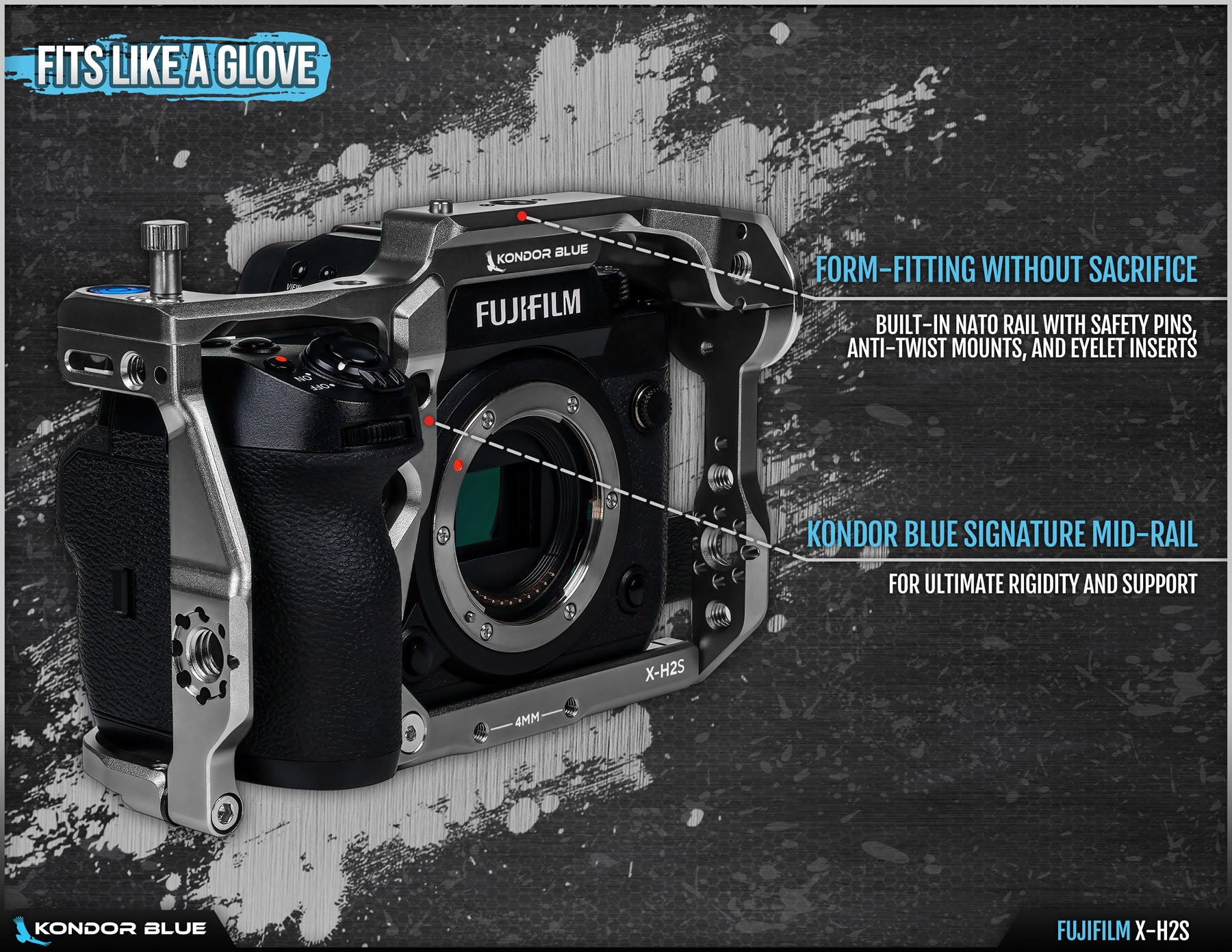Speed, strength, and sleekness. When creating the cage for the Fujifilm X-H2 & X-H2S we knew we needed to anchor the design on those three pillars. The cage leverages KONDOR BLUE’s brand-new Hatch System which is a completely unique way to mount your camera cage with as few bolts as possible while remaining rock solid. The KONDOR BLUE Mid-Rail and eyelet inserts provide unparalleled structure and rigidity to the camera and now only require 4 bolts to fully assemble/remove the cage.