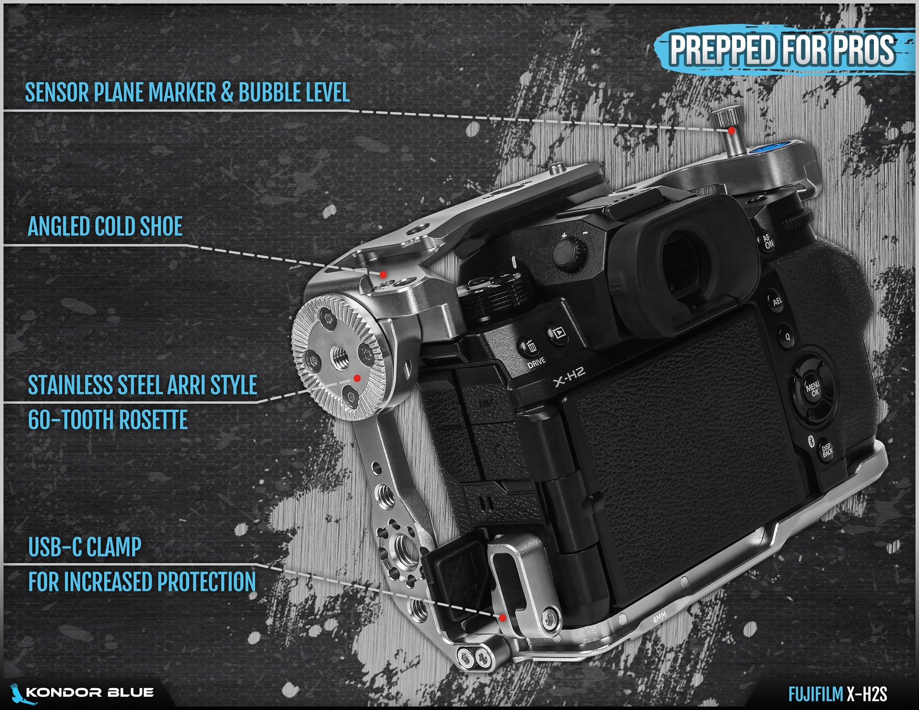 Beyond the new assembly style, the Fujifilm X-H2S cage includes all of the pro features you’ve come to expect from KONDOR BLUE. Including the NATO rail on the Side and Top Plates, stainless steel ARRI style rosette, ARRI style anti-twist mounts (¼ 20 and ⅜ 16), USB C clamp, built-in tools for assembly, angled cold shoe, and our signature bubble level.