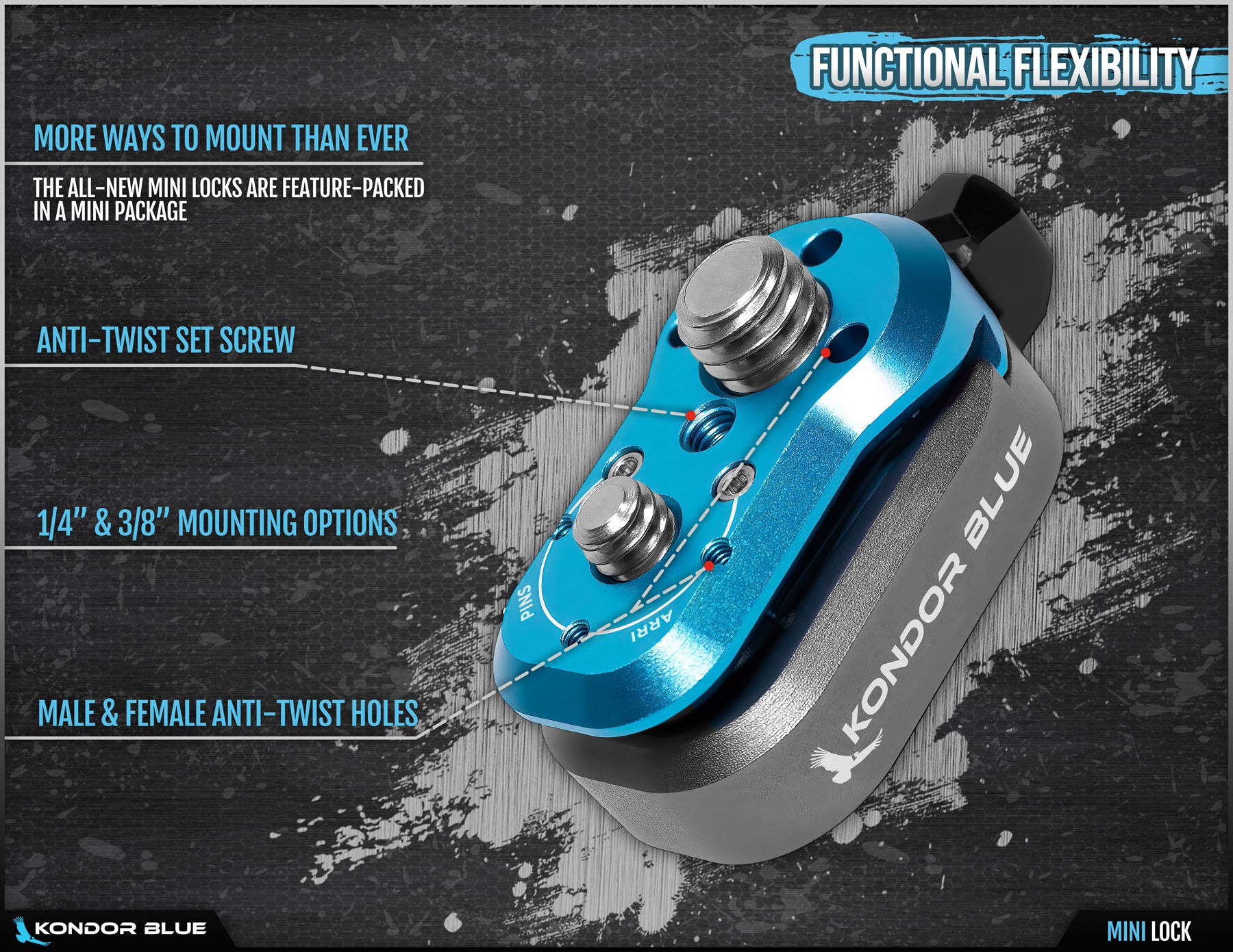 Each line, cut, and engraving has carefully been considered to enhance the reliability of Mini Lock. Available in a variety of colorways, the KONDOR BLUE Mini Lock System is the perfect solution for mounting crucial cinema accessories.
