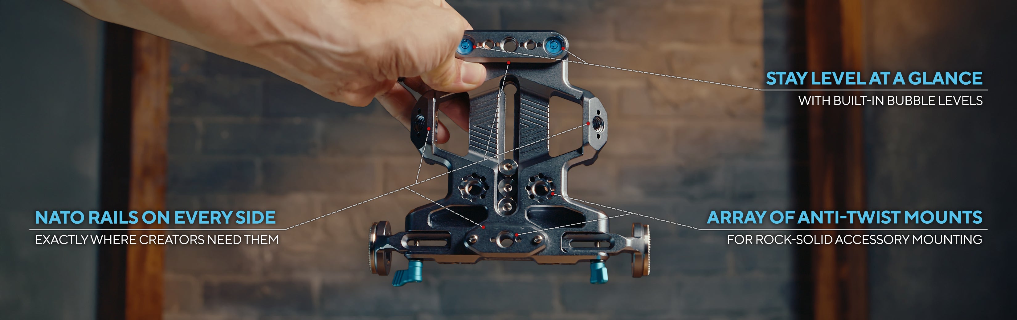 Integrated NATO rails make it effortless to pair with the Hollywood Handle, while the left and right side rails offer your choice of ⅜”-16 anti-twist mounting points or NATO interfaces. These rails also act as structural stabilizers for the Top Plate, making contact with the camera body via rubber pads for a secure, vibration-resistant fit.