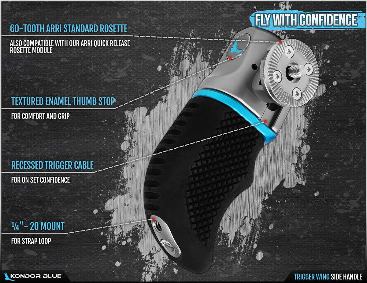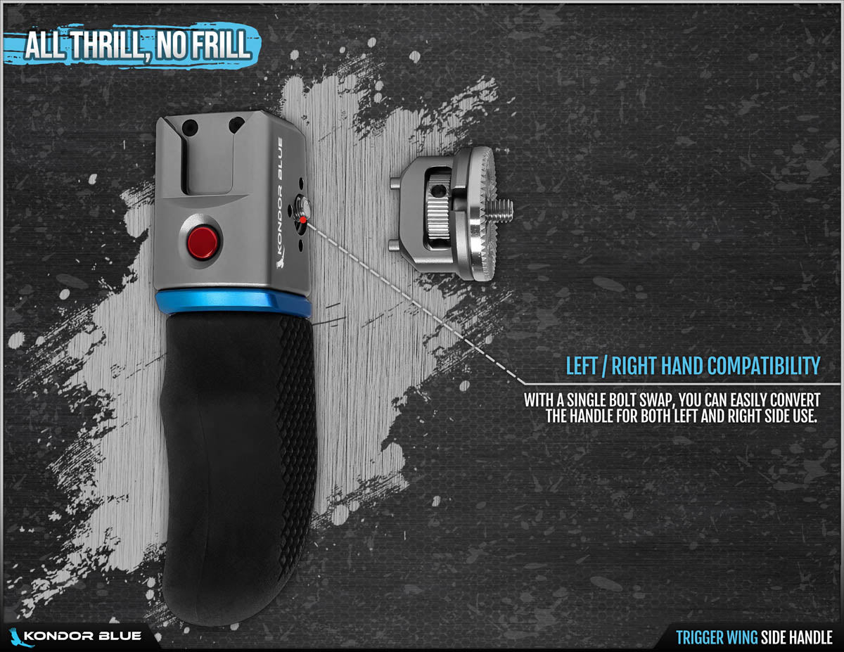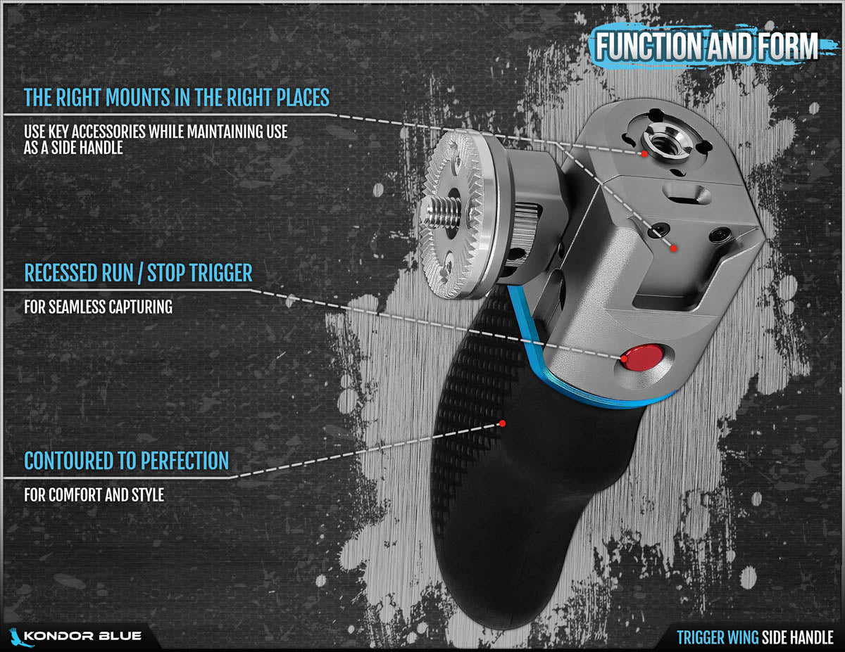 A camera cage side handle is a rig staple these days and it’s something that has been on our minds for a long time. But in true KONDOR BLUE fashion, we didn't want to make a dozen variants of a side handle—we wanted to create one that would rule them all. Thus, the KONDOR BLUE Wing Side Handle with an ergonomic grip was born!